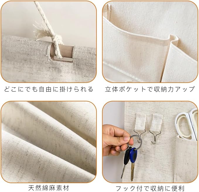 【ナチュラルな素材感】天然素材の麻と天然木を使用したウォールポケットで、シンプルながらも温かみのあるデザインが特徴です。