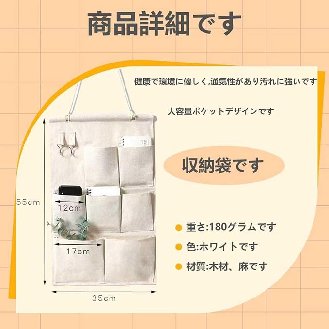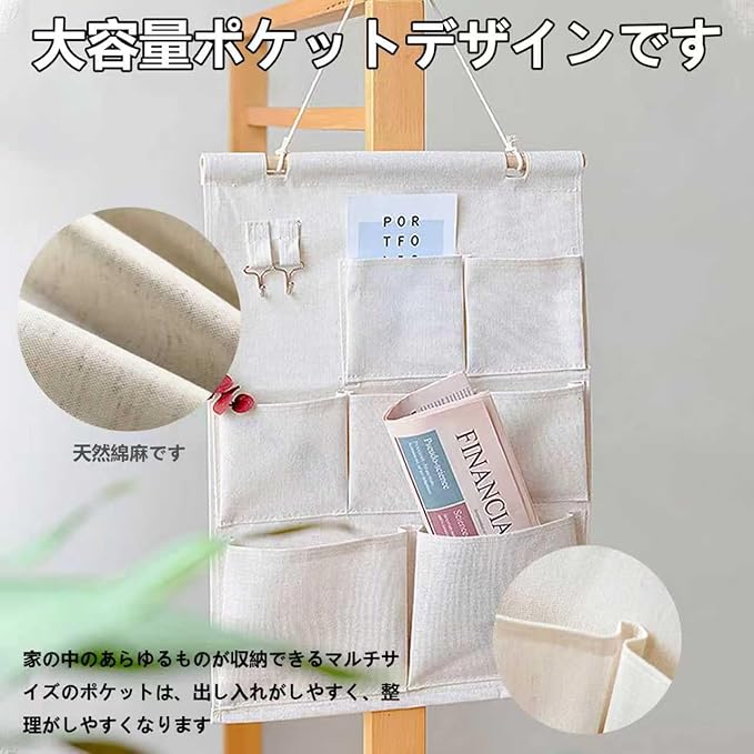 自然素材の魅力を活かしたウォールポケットは、シンプルかつ温かみのあるデザインが特徴です。天然麻と木材を使用することで、お部屋にナチュラルな雰囲気をプラスします。また、付属のフックを使えばドアや壁に簡単に取り付けでき、狭いスペースでも効率的に縦向きの空間を利用することができます。 この壁掛け収納ポケットは3層7つのポケットを備えており、郵便物や文具、そしてさまざまな小物を整然と整理することができます。さらに、上部には鍵やアクセサリーを掛けるためのフックも付いているので、日常使いに非常に便利です。 寝室、キッチン、バスルーム、オフィス、学生寮など、さまざまな場所で使用できる多目的性も魅力の一つです。軽くて小さな物を収納するのに最適ですが、重い物や危険な物(例えば刃物)の使用は避けてください。また、定期的なメンテナンスによって、天然麻の柔らかな質感を長く保つことができます。 このウォールポケットを使って、あなたの生活空間をより快適で整然としたものにしましょう。