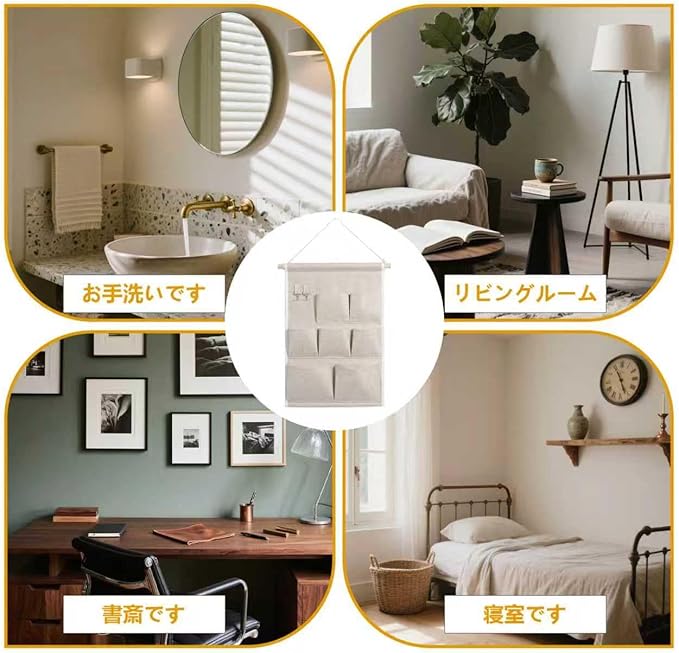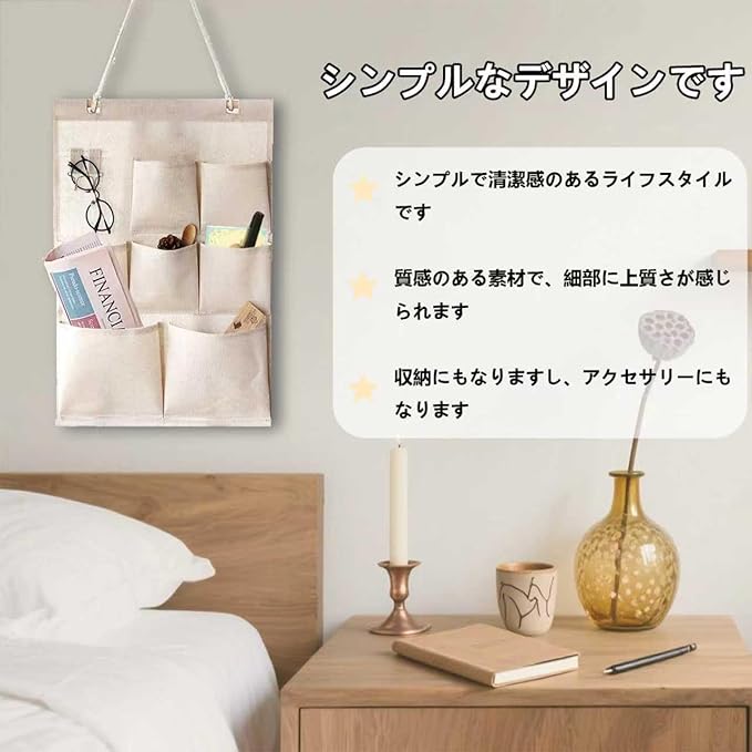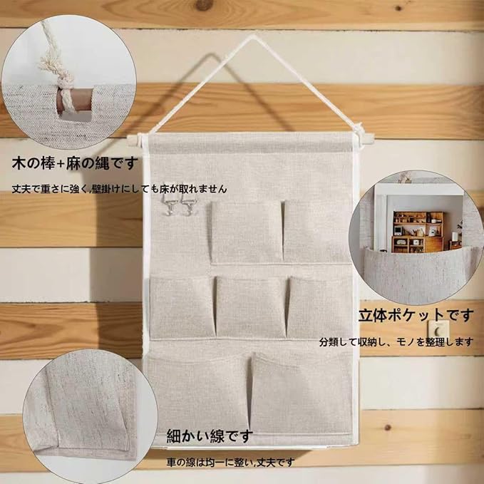 自然素材: 天然麻と木材を使用した壁掛け収納ポケット。シンプルで温かみのあるデザインが特徴です。