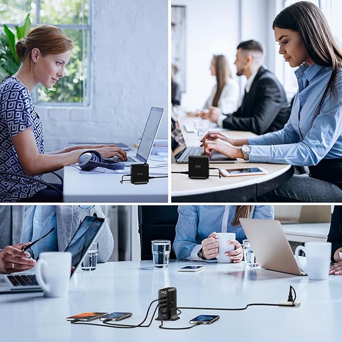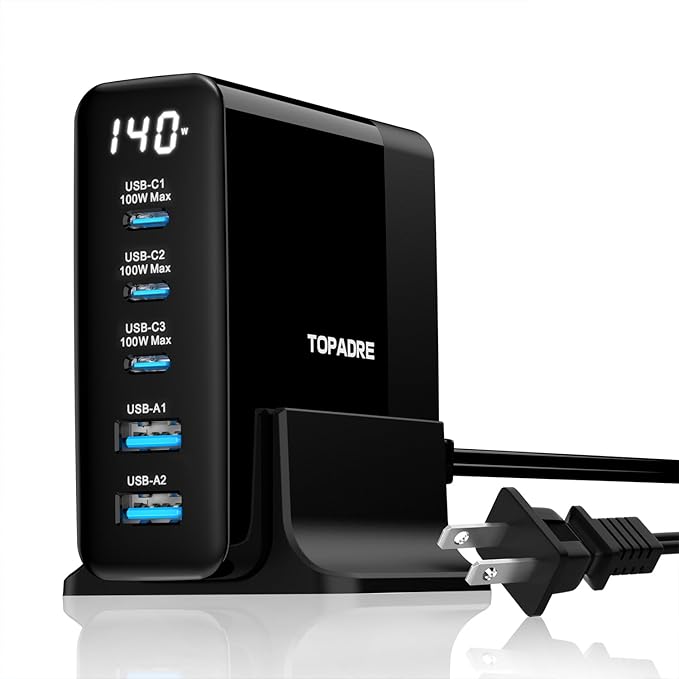 【5IN1 急速充電器・コンパクトデザイン・単ポート最大 100W】TOPADREはハイパワー AC アダプター 充電器の専門HOTです;3つのUSB-Cポート(単一ポート充電最大100W)と2つのUSB-Aポート(単一ポート充電最大60W)を搭載し、ノートPC・タブレット・スマホ・イヤホン・スマートウォッチなど複数機器の同時急速充電が可能。合計140Wの高出力で、5台の機器を同時に超速充電することができます。一つのUSB タイプc 充電器コンセントだけで、usb コンセント占有やデスク周りの煩雑さを解消し、ご家族の複数デバイスを同時に充電可能となり、充電時間を大幅に短縮できます。複数デバイスを同時接続時、新しいデバイスを接続/抜去すると、充電器はスマート保護システムにより各ポートの電力を自動再分配します。この際、電力変化によるデバイスへの影響を防ぐため、一時的な断電が発生する場合がありますが、充電はすぐに復旧します。全てのデバイスを安全に保護するための正常な動作プロセスです。