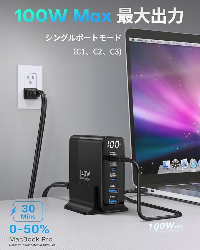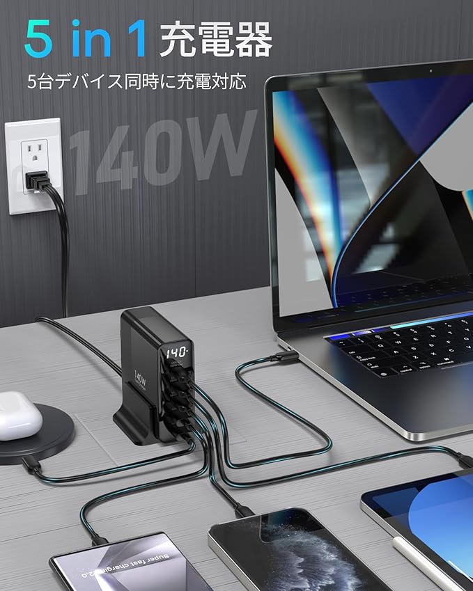 140W 急速充電器 PD タイプ c 充電器【100W Max*USB-C*3+USB-A*2+ディスプレイ搭載+PSE認証】5ポート Type-c充 電器 MacBook M4 M3 /ipad Pro/iPhone 17/16/15/14/13 Pro Max/Samsung Galaxy Note各種デバイス対応 GaNIII(窒化ガリウム) 1.5mの電源ケーブル付き