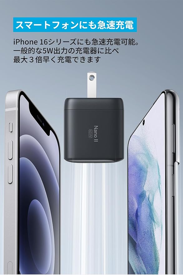 幅広い機器に急速充電可能: USB PowerDelivery (PD) 対応の65W出力で、スマートフォンからノートPCまで幅広い機器に急速充電できるUSB充電器です。利用機器毎に異なる充電器を持ち運ぶ必要はありません。