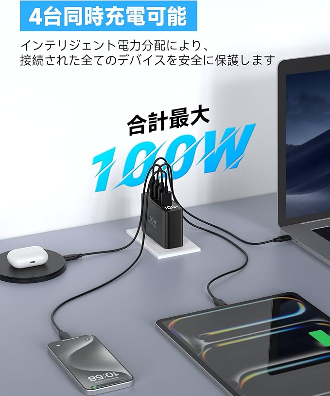 100W 急速充電器 PD 充 電器 Type-c Macbook 充 電 器【折り畳み式/LEDディスプレイ搭載/GaNIII技術/超低温/PSE技術基準適合】4ポート USB充電器 4台同時充電 iPad/iPhone/Galaxy S24/Android/MacBook/Dellなど多機種対応 黒色