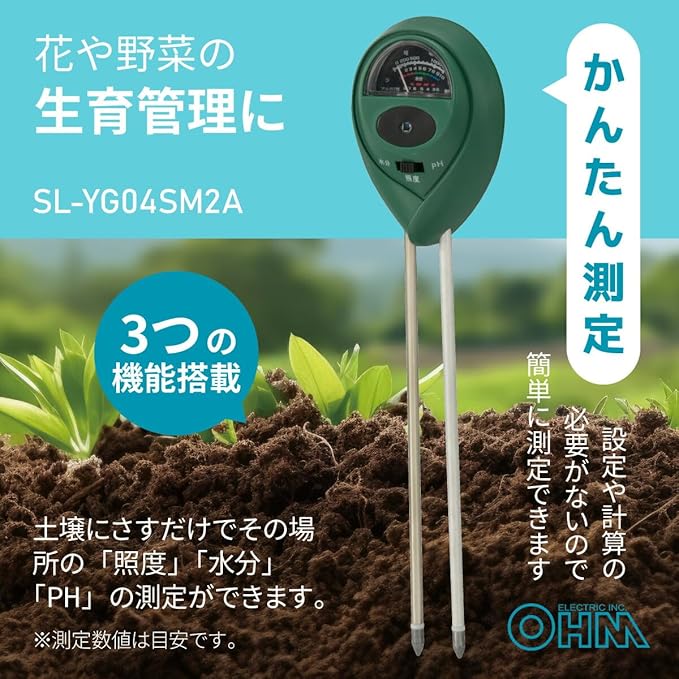 オーム(OHM)オーム電機 PH測定器 土壌 水分測定器 照度測定器 差込式 ガーデン用測定ツール 電池不要 土壌メーター 土壌計測器 SL-YG04SM2A 08-7004