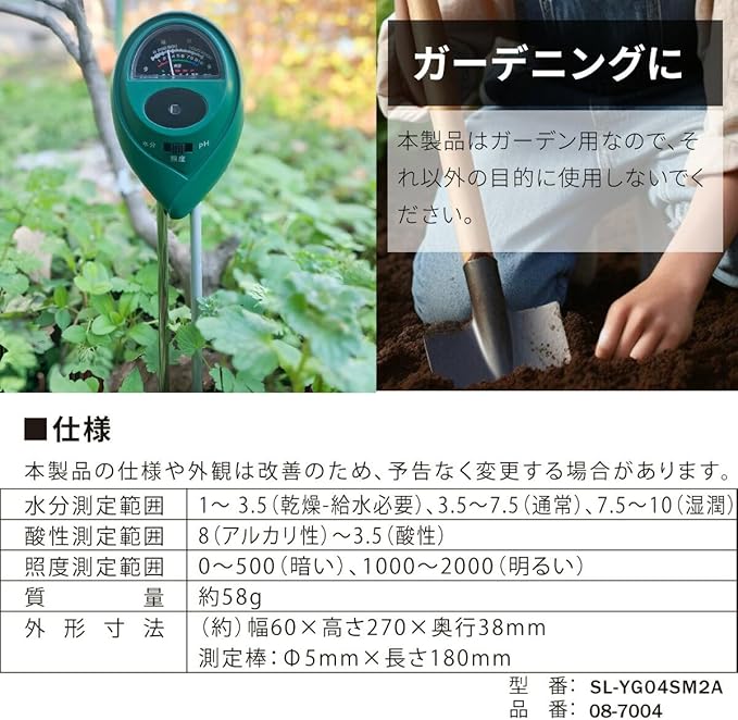 【 仕 様 】 ◆水分測定範囲:1~3.5(乾燥-給水必要)、3.5~7.5(通常)、7.5~10(湿潤) ◆酸性測定範囲:8(アルカリ性)~3.5(酸性) ◆照度測定範囲:0~500(暗い)、1000~2000(明るい) ◆質量:約58g