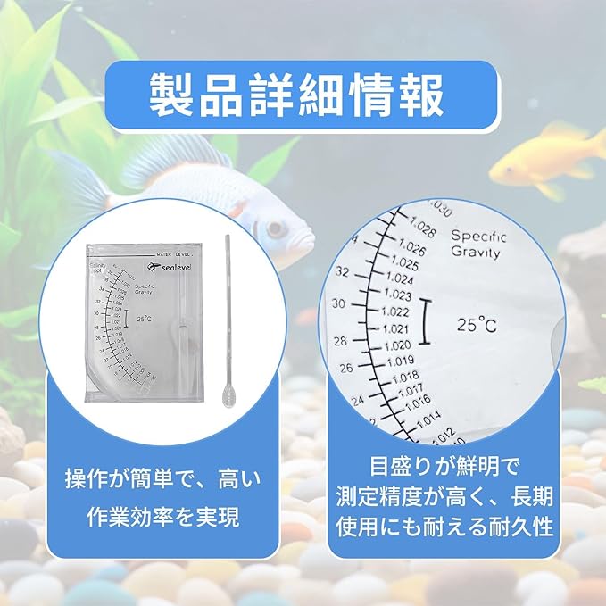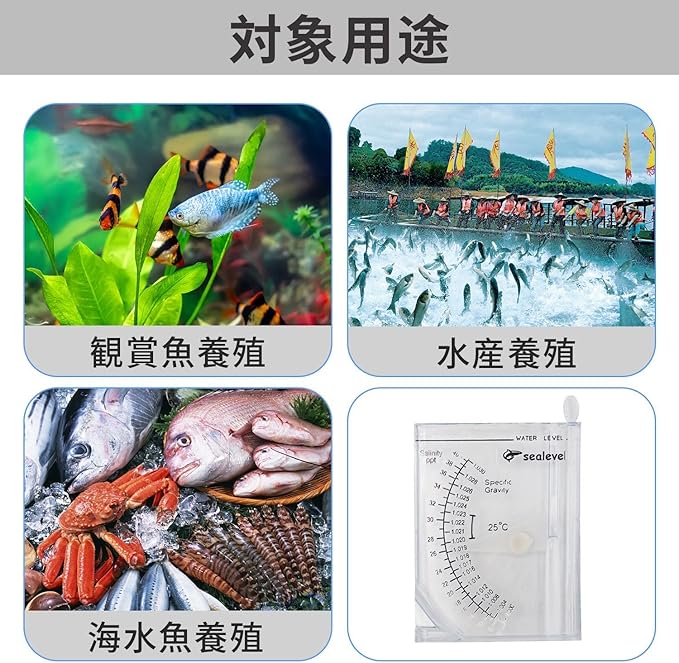 【特長】海水塩分濃度測定専用設計。直感的な操作と明瞭な目盛で、魚介類の最適生育環境を簡単に確認。