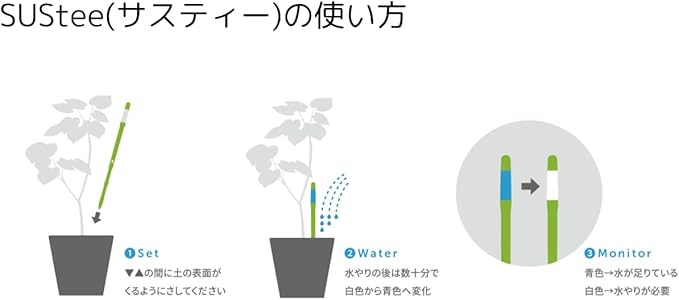 【使い方】 インジケーター(透明な部品の部分)を上にして、土に挿してください。 三角マークの間に土がくるようにしてください。 透明な部品の部分が、水やり後に青くなります。