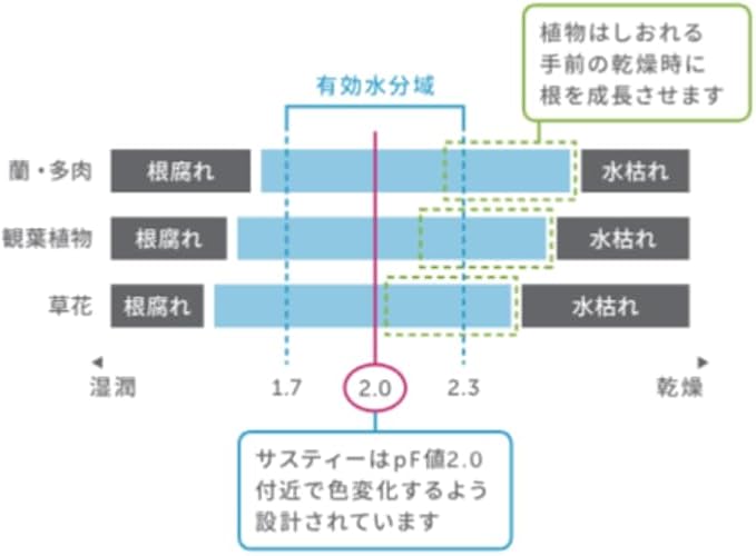 鉢の土に水がたっぷりある時はインジケーターが青色に、水が足りなくなると青色が白色に変化します。