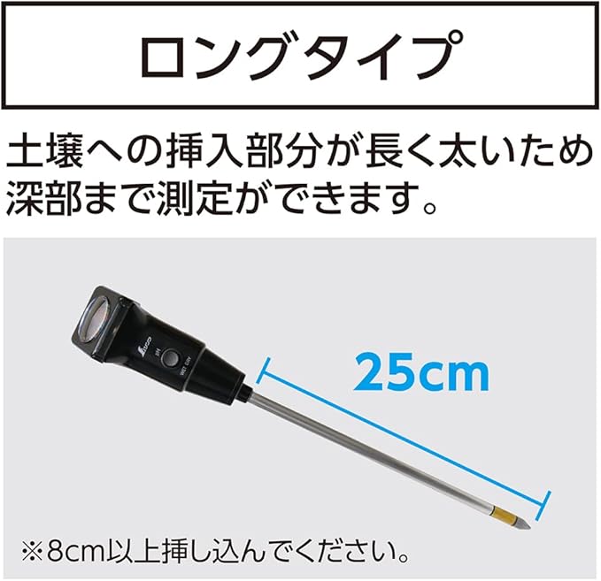 土壌に水を撒いてよく混ぜ20分程度置いてから挿し込むと約1分で土壌酸度が測れます。