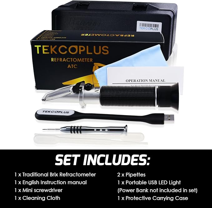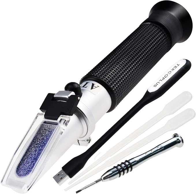 品質と軽量:屈折計は最高品質のアルミニウムとゴムで作られており、自動温度補正(ATC)機能とポータブルUSBLEDライトが付属しています。