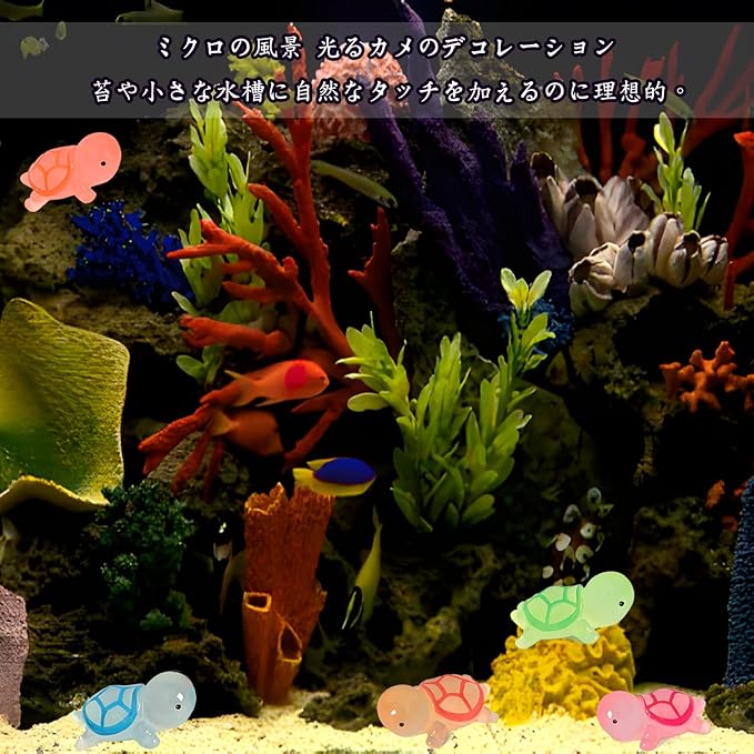 1.[商品内容]カメのオーナメント5ピース。5色:ローズレッド/ブルー/オレンジ/イエロー/グリーン。 各色1個ずつ、小亀の大きさ:約3.4*1.3cm。 2.[高品質の素材]小さなカメのおもちゃは高品質の合成樹脂材料で作られており、専門的に研磨され、表面は滑らかな手触りで、画像は鮮やかです。 水中に長時間置いても傷つきません。 3.[製品の特徴] この装飾は明暗適応性があり、低照度環境でユニークな発光効果を発揮します。 暗い環境でも柔らかい光を放ち、神秘的でロマンチックな感じを与えます。 さらに、シンクに美しい景観を加え、夜のひとときに魅力的な視覚的な楽しみを提供します。 この装飾のデザインは非常に特別で、空間に独特の雰囲気を作り出すことができます。 4.[多用途]カメのモデルは小さくてかわいいので、水槽の装飾として使用できます。 また、ガラス容器、植木鉢、パーティーや友人の机を飾ることができます。 また、かわいくて魅力的な友達にプレゼントすることもできます! 5.[注意]ミニカメのおもちゃはサイズが小さいので、誤飲を防ぐために3歳未満のお子様が一人で遊ぶことはお勧めしません! 推奨年齢:3歳以上のお子様に適しています。