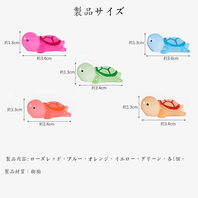 [商品内容]カメのオーナメント5ピース。5色:ローズレッド/ブルー/オレンジ/イエロー/グリーン。 各色1個ずつ、小亀の大きさ:約3.4*1.3cm。