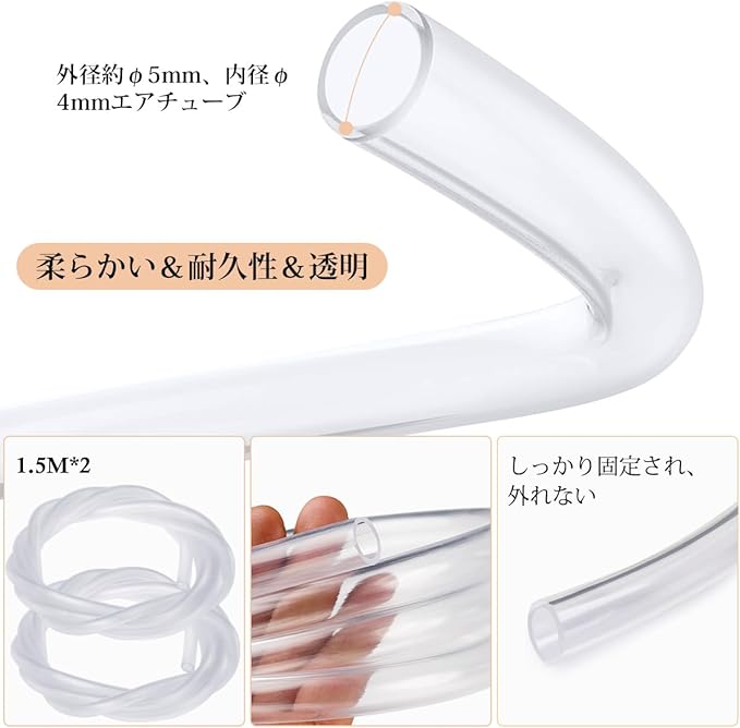 [標準エアチューブ(PVC)] 外径約φ5mm、内径φ4mmのエアチューブはほぼすべてのエアポンプに対応し、柔らかく透明なPVC材質製で、柔軟性と耐久性を兼ね備えています。長さ1.5Mの2個は、ほとんどの水槽に十分です。