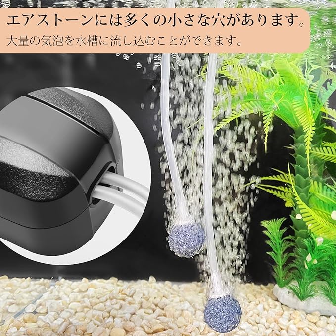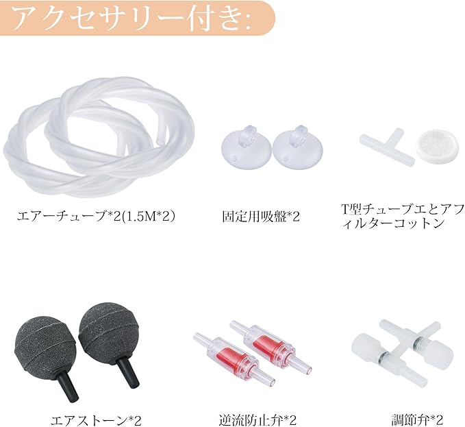 [アクセサリーセット] 1つの水槽用エアポンプに必要なすべてが含まれています:1.5M*2本のエアチューブ、逆流防止弁*2、エアストーン*2、吸盤*2、T字チューブ*1、エアフィルター*1。