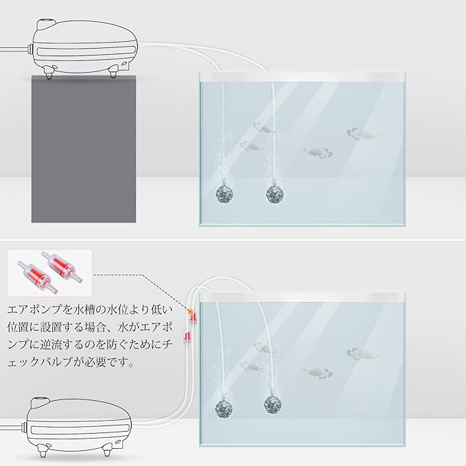 [逆流防止弁] エアポンプが水槽の水位より低い位置にある場合、逆流防止弁を設置して水の逆流を防ぎ、ポンプの損傷を防止します。