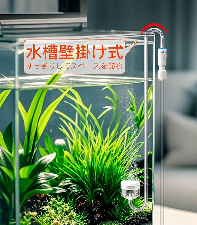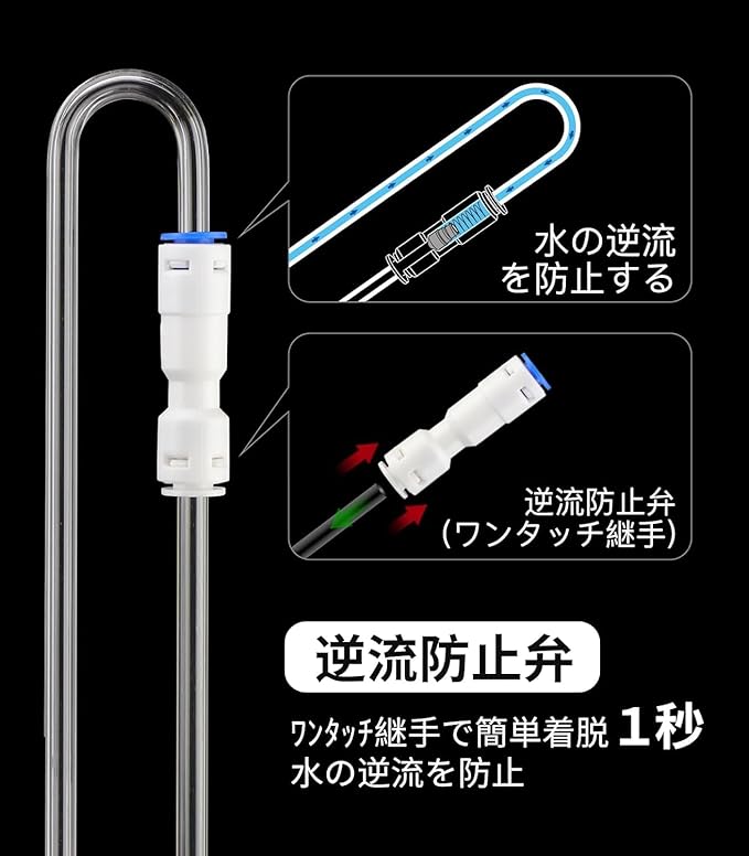 【外観スッキリ】S型デザインで、ワンタッチ式逆流防止弁が付いて、簡単にチューブの取外しができます。水槽内のチューブがすっきり!