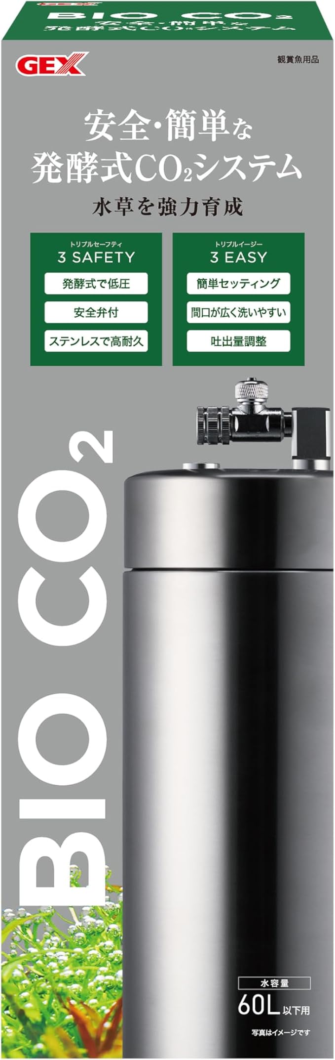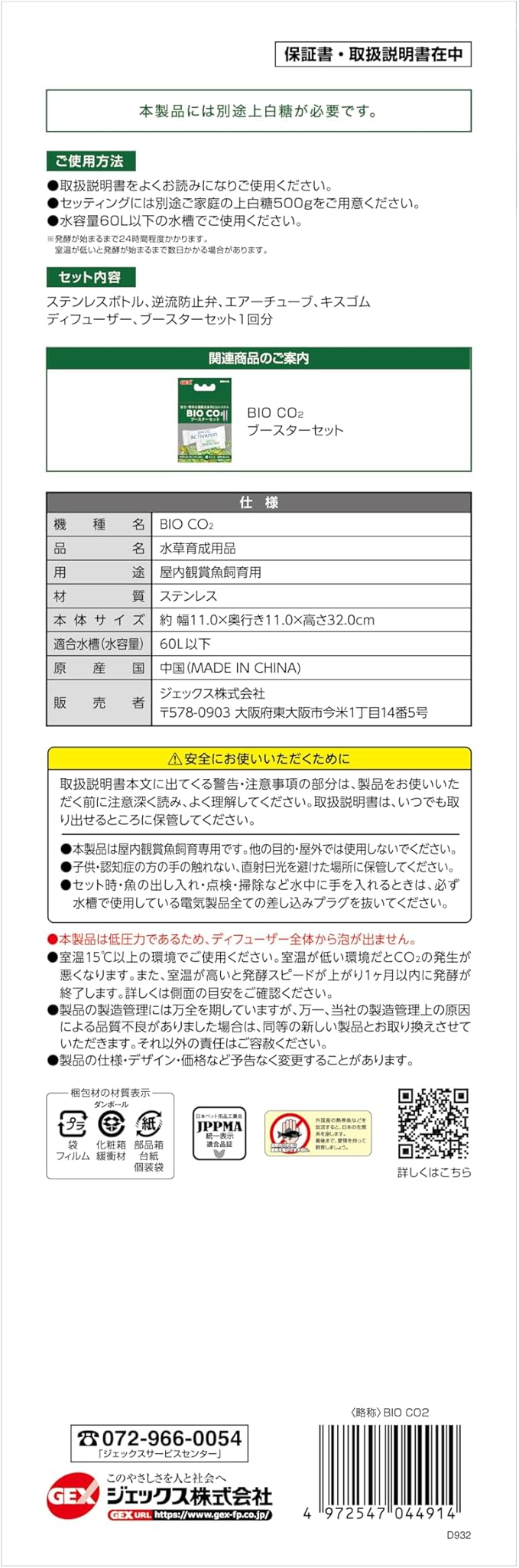 安全・簡単な発酵式CO2システム 水草の成長には光、CO2、栄養のバランスが大切です。不足しがちなCO2を添加することで、水草の光合成を促進し酸素を発生させるので、水草の成長・維持だけではなく魚にとっても最適な水槽内環境をつくることができます。 安全・簡単な発酵式CO2システムで水草を強力育成! 1回のセッティングで約1か月持続 ※室温20℃の場合(持続期間は室温によって異なります。) ●化学式やボンベ式などの高圧力タイプとは異なり、植物原料を発酵させてCO2を供給しつづける低圧力システム ●万一高圧になった場合でも安心な高耐久ステンレスボトルと安全弁付なので、初めての方にも安心 ●1回のセッティングで約1ヶ月CO2を供給することができます。※室温20℃の場合(持続期間は室温によって異なります。) ●ご家庭の上白糖を使って簡単にセッティングができます ■3 SAFTY■(1)発酵式の低圧システム。最大圧力で0.13Mpa (2)万一高圧になっても安心な安全弁付き (3)高耐久のステンレスボトル&シリコンパッキンで完全密封 ■3 EASY■(1)4ステップ簡単セッティング。上白糖を入れる→ブースターを入れる→アクティベーターを入れる→水道水を入れる (2)洗いやすくセッティングしやすい開口部 (3)吐出量を調整できるレギュレーター 【ご使用方法】●取扱説明書をよくお読みになりご使用ください。●セッティングには別途ご家庭の上白糖500gをご用意ください。●水容量60L以下の水槽でご使用ください。※発酵が始まるまで24時間程度かかります。室温が低いと発酵が始まるまで数日かかる場合があります。 ※本製品は低圧力であるため、ディフューザー全体から泡が出ません。※室温15℃以上の環境でご使用ください。室温が低い環境だとCO2の発生が悪くなります。また、室温が高いと発酵スピードが上がり1ヶ月以内に発酵が終了します。詳しくは側面の目安をご確認ください。 【セット内容】ステンレスボトル、逆流防止弁、エアーチューブ、キスゴム、ディフューザー、ブースターセット1回分