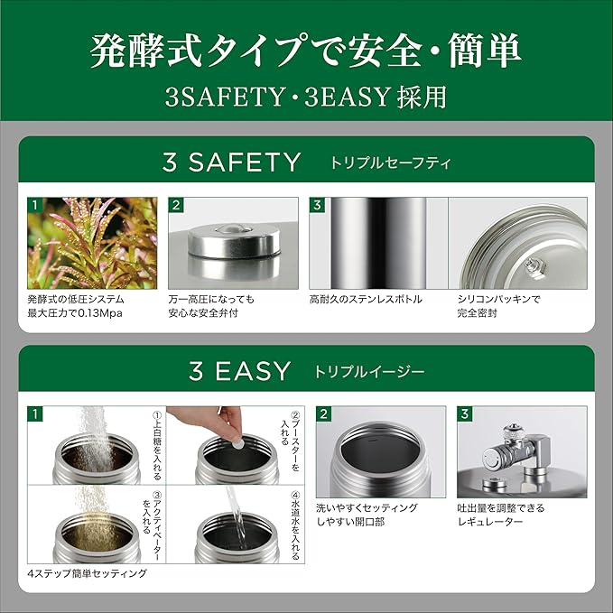 ■3 SAFTY■(1)発酵式の低圧システム。最大圧力で0.13Mpa (2)万一高圧になっても安心な安全弁付き (3)高耐久のステンレスボトル&シリコンパッキンで完全密封 ■3 EASY■(1)4ステップ簡単セッティング。上白糖を入れる→ブースターを入れる→アクティベーターを入れる→水道水を入れる (2)洗いやすくセッティングしやすい開口部 (3)吐出量を調整できるレギュレーター