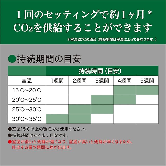 ●化学式やボンベ式などの高圧力タイプとは異なり、植物原料を発酵させてCO2を供給しつづける低圧力システム ●万一高圧になった場合でも安心な高耐久ステンレスボトルと安全弁付なので、初めての方にも安心 ●1回のセッティングで約1ヶ月CO2を供給することができます。※室温20℃の場合(持続期間は室温によって異なります。) ●ご家庭の上白糖を使って簡単にセッティングができます