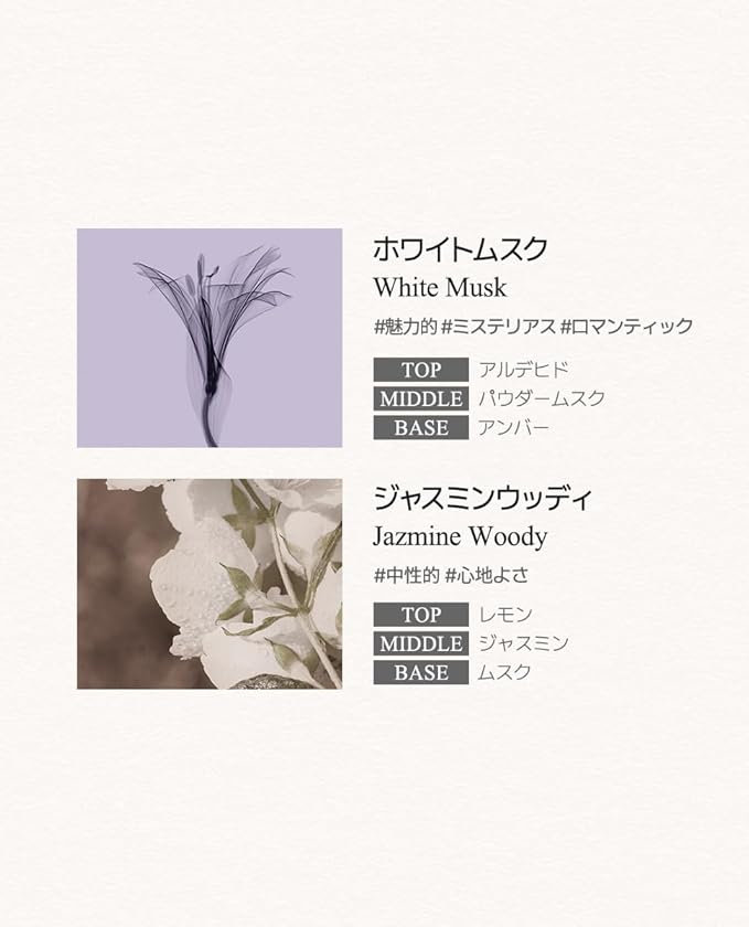 【ホワイトムスク】ムスクとほのかな花の香りが特徴。相手に優しい印象を与えるようなフレグランスです。
