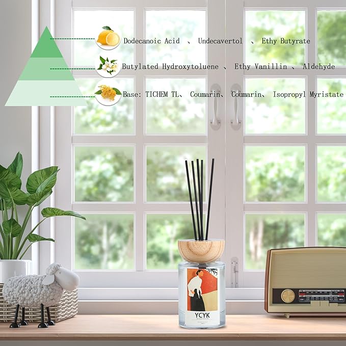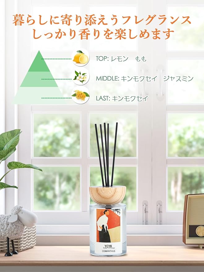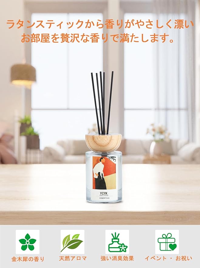 【本物の金木犀に近い香りを再現】再現することが非常に難しいとされる金木犀の香り。ディフューザー本物に近いやさしい香りなので 、強い香りが苦手な方でも 使っていただきやすくなっております。香水と同じ、高品質な香料を配合してます。季節の香りを、いつでもお家でお楽しみいただけます。