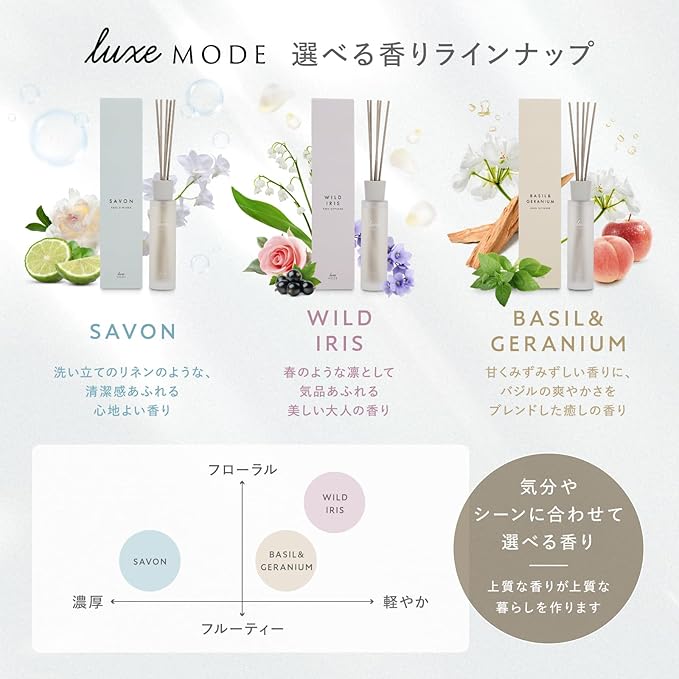 ✅【選べる3種の香りラインナップ】 清潔感あふれるSAVON(サボン)、気品あるWILD IRIS(ワイルドアイリス)、癒しのBASIL & GERANIUM(バジル&ゼラニウム)から、お好みの香りをお選びいただけます。