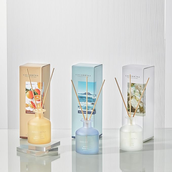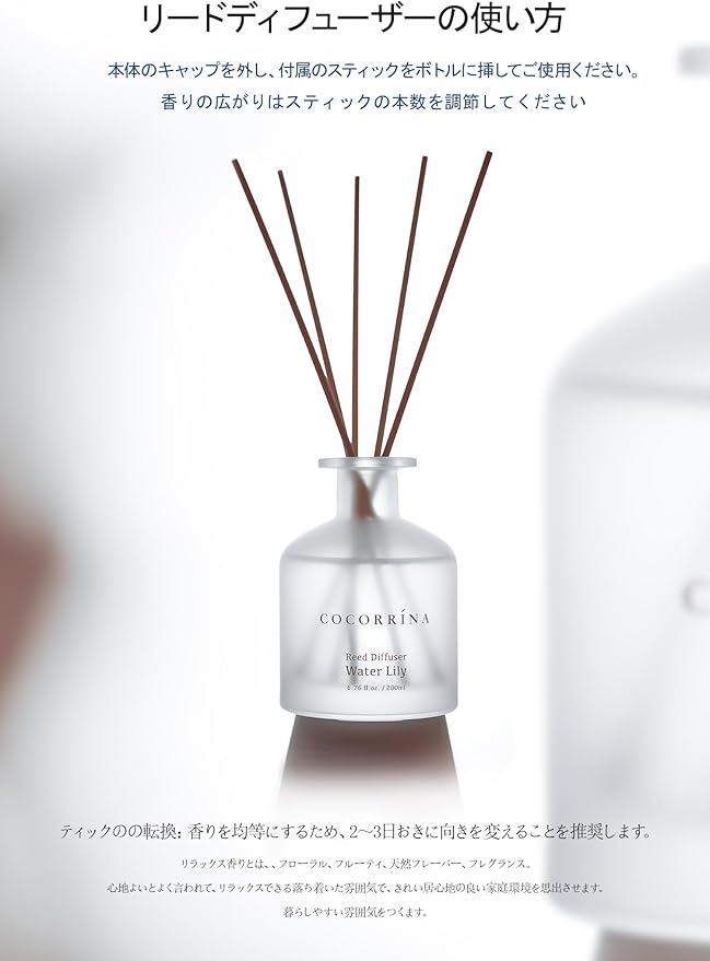 商品構成 :200ml の透明ガラスボトル(エッセンシャルオイルブレンドにフレグランスを配合した液体入り)1 本と、コットンスティック8 本を含みます