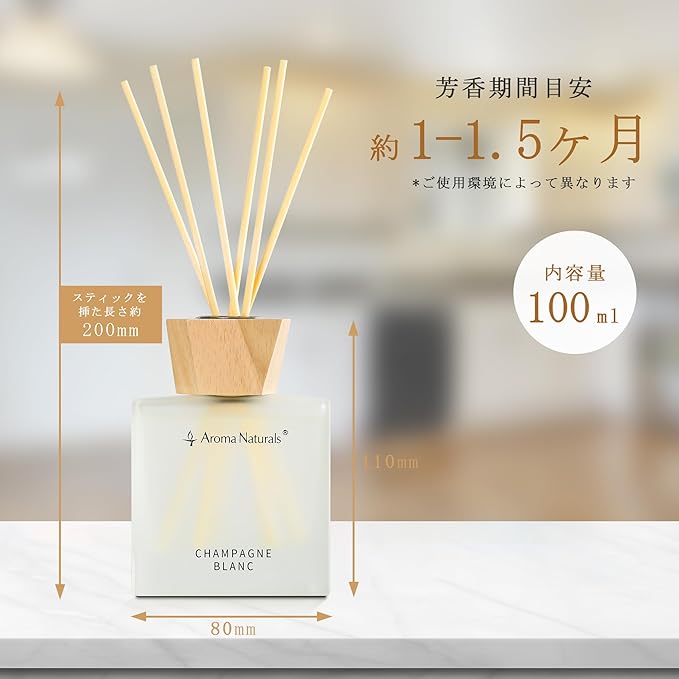 『香り持続時間』約1-1.5ヶ月(芳香期間は、スティックの本数、気候、温度や湿度、部屋の広さや置き場所によって異なります。)