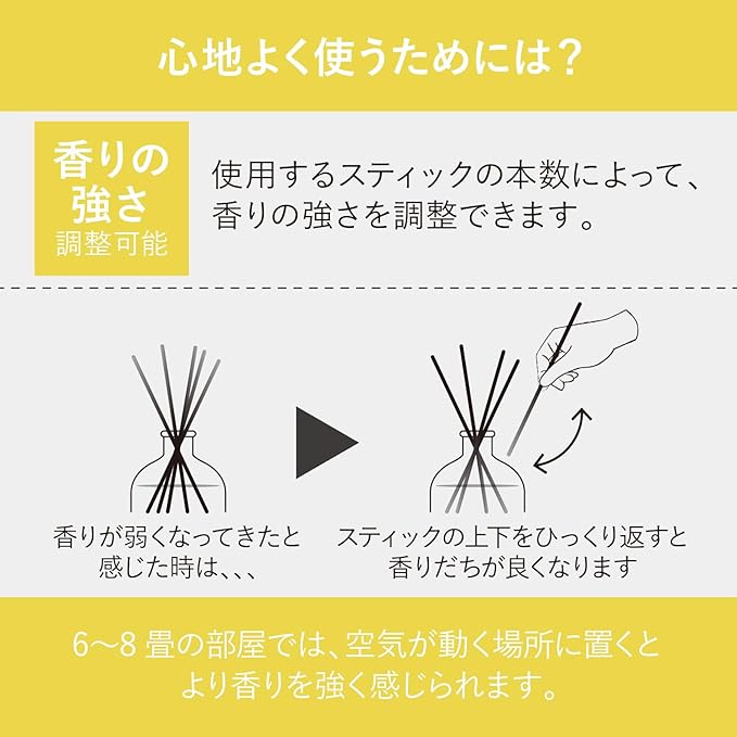 透明フィルムをはがしてフタを開け、付属のスティックを挿して、ひろがる香りをお楽しみください。