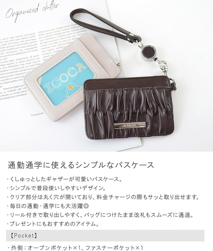 ・通勤通学に使えるシンプルなパスケース。・くしゅっとしたギャザーが可愛いパスケース。・シンプルで普段使いしやすいデザイン。・クリア部分は丸く穴が開いており、料金チャージの際もサッと取り出すことができます。・毎日の通勤・通学にも大活躍◎・リール付きで取り出しやすく、バッグにつけたまま改札もスムーズに通過。・プレゼントにもおすすめのアイテム。