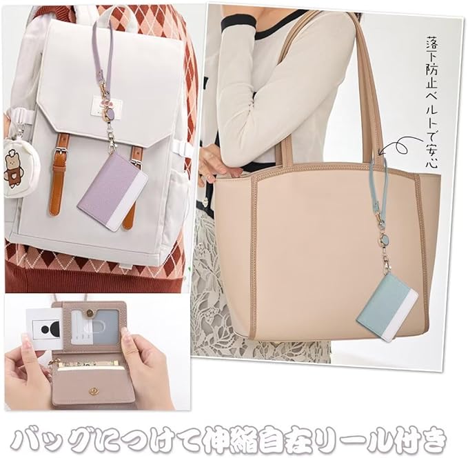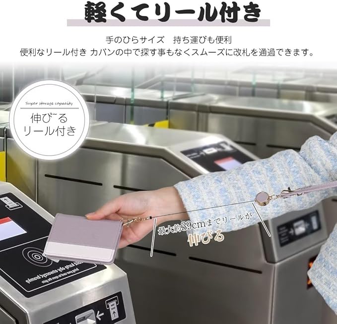 【パスケースリール付き】リールは 金属リールを使用しています、金属リールが伸びて即座に出し入れして使うことができます、バッグにつけたままセキュリティゲートも改札も、しゃがまずに楽々タッチ。