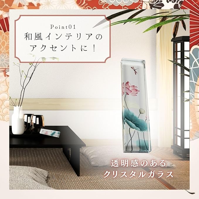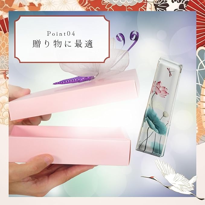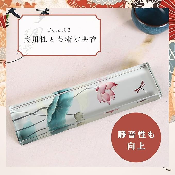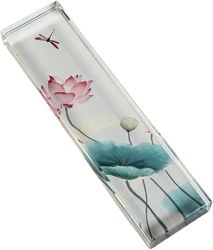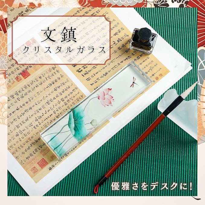 優雅で落ち着いたデザインのおしゃれな文鎮: 透明感のあるクリスタルガラスに描かれた蓮やトンボが、静かな美しさを放ち、書道やデスクワークの邪魔をせずに集中をサポートします。