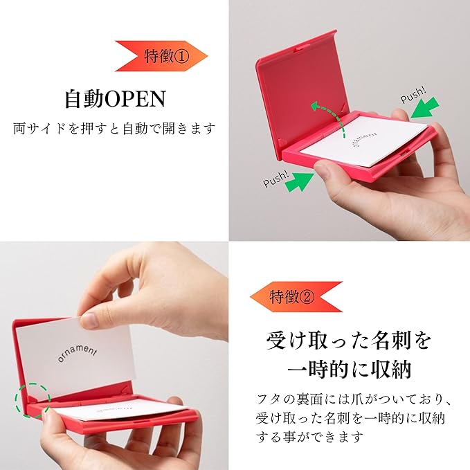 両サイドを持って軽く押すと、ゆっくりとフタが開くと同時に底面のフラップが名刺を持ち上げ、スムーズに名刺を取り出せるように工夫