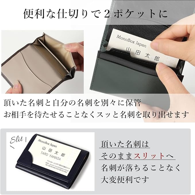 またスリット付きです。頂いた名刺をスリットにサッと入れてそのまま商談、会議をすることができます。