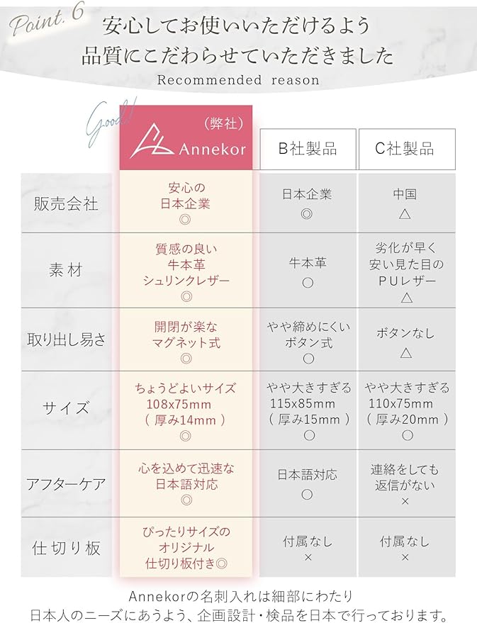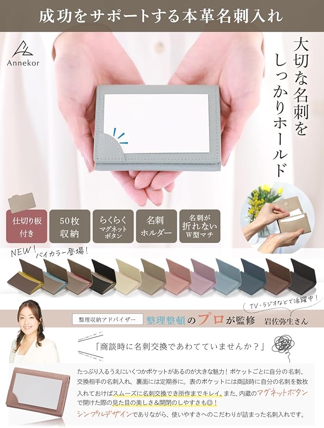 ✅【大切な名刺をしっかりホールド】 商談中に資料を広げたときなど、名刺入れを動かして相手の名刺を落としてしまった…そんなご経験はありませんか?Annekorの名刺入れは、名刺がずれないよう「ホールドポケット」付き。日本の一般的な名刺サイズに合わせた設計で、安心して商談に集中できます。