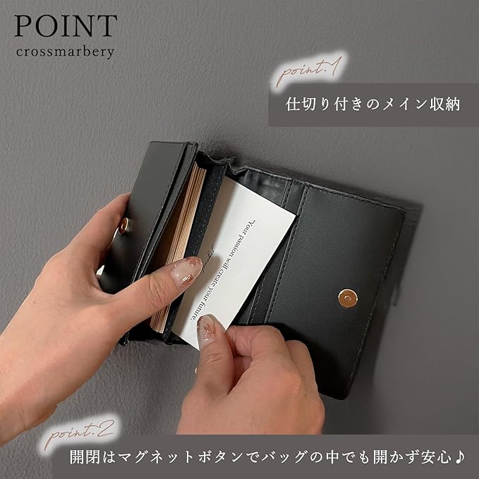 開閉はマグネットボタンとなりメイン収納には仕切りが付いています。メインポケットのほかにカードポケットが3つあり、 名刺入れとしてはもちろんカードケースとしても◎