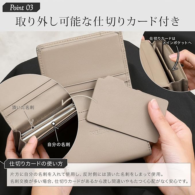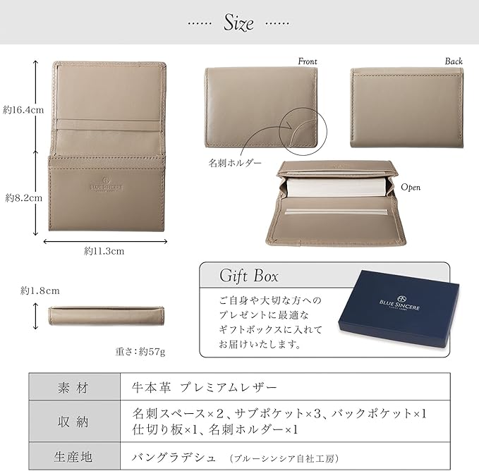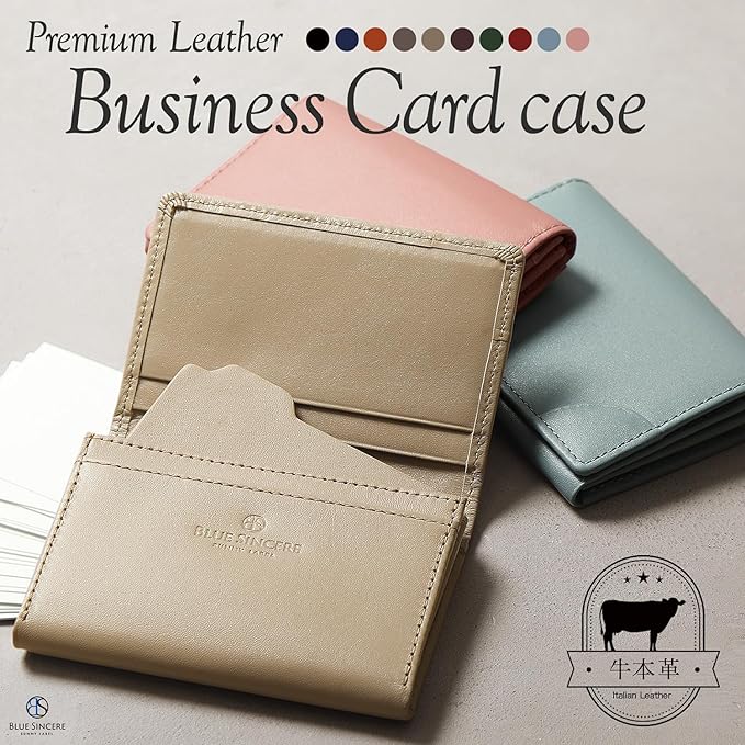 【こだわりの素材と機能性】BLUE SINCEREオリジナルで開発した上質なプレミアムレザーを使用し、しっとりと手に馴染む質感と高級感ある風合いを実現しました。見た目の美しさだけでなく、使い込むほど手に馴染む本革ならではの魅力をお楽しみいただけます。コンパクトなサイズ感ながら、名刺を40枚以上収納可能な大容量設計。日常使いはもちろん、ビジネスシーンでもスマートに活躍する、機能性とデザイン性を兼ね備えたアイテムです。