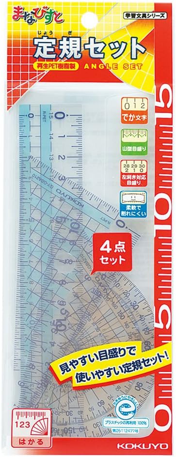 ●柔軟性があり割れにくい再生PET樹脂製タイプです。●三角定規は2枚の色を変えることで見分けやすくしました。●目盛りの長さに強弱をつけ、5cmごとに数字を大きくし読みやすくしました。また、通常目盛りの下に、右側から始まる左利き対応の目盛りが付いています。●持ち運びに便利なソフトケース付き。まとめて収容できるので便利です。●セット内容/直線定規・三角定規・分度器●材質/本体:R-PET、ケース:オレフィン系樹脂●目盛り寸法/直線定規:15cm、三角定規:10cm●外寸法(ケース収納時)/W175 D75 H5●専用ソフトケース付き