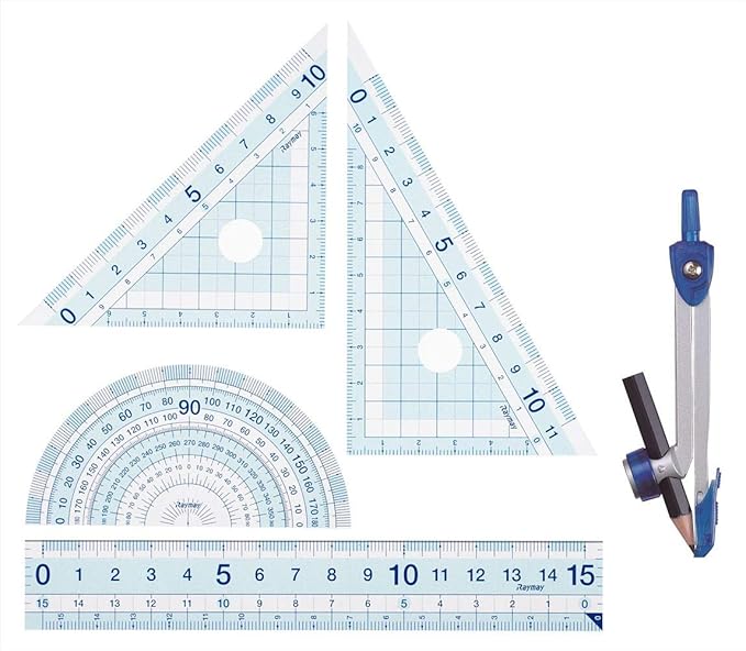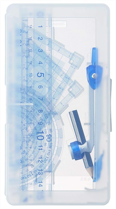 セット内容:直定規(15cm)、三角定規、分度器、鉛筆用コンパス(自動中心器付き)、ケース