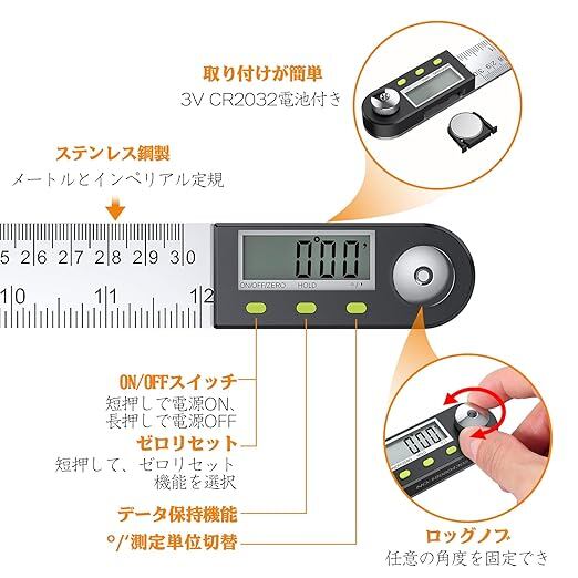 【簡単で正確な測定】読みやすいデジタルLCDディスプレイ、精度 0.3 、分解能0.05 、相対角度と絶対角度の測定が可能で、ゼロリセット機能とデータホールド機能が備えています。