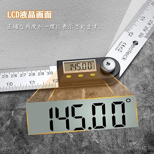 【300mm デジタル角度定規】本製品はステンレス鋼製(ボディ+ロッキングノブ)デジタル分度計です。木工、建築材料、学校教育エイズ、学生文具、機械加工などに適しています。文具、機械加工などに適しています。