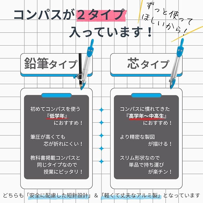 ✏️【中高生まで使える!】低学年におすすめ「鉛筆タイプ」と高学年以降も使える「芯タイプ」の2種類のコンパスをセットにしました!