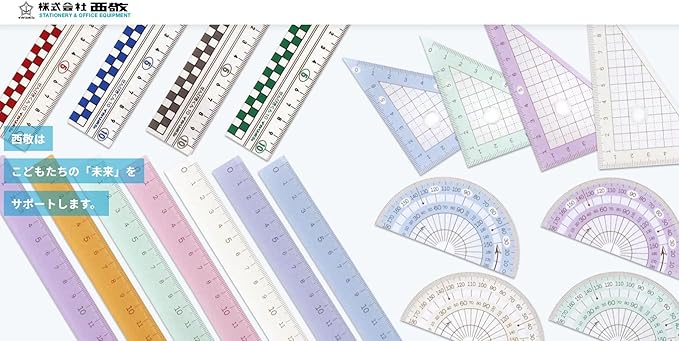 【本体サイズ】定規:20 180 2.0mm(17cm目盛)三角定規:二等辺三角形/85 85 120 1.5mm、直角三角形/70 120 140 1.5mm 分度器:90半円 1.5mm