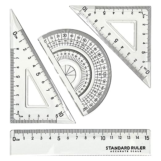学校で使う基本の定規4点に持ち運びに便利なケース付き!三角定規はどの辺でも測れる3辺メモリ、分度器は印がつけやすい中間スリットがついています。
