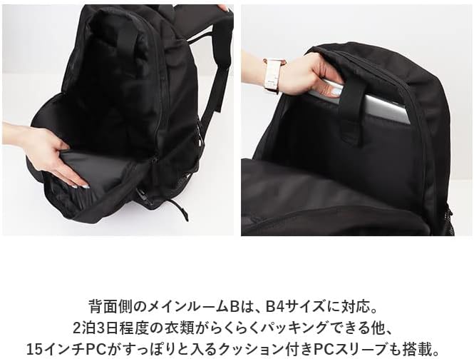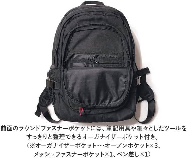 普段使いはもちろん、タウンユースからレジャーシーンまで活躍する機能的なデイパック。高い収納力を備え、荷物が多い日の移動も楽々! さらに、背中や肩に触れる部分にはメッシュ素材を使用し、通気性に優れ蒸れを軽減してくれます。メインルームはB4サイズ対応で、フロントの広々としたポケットにより荷物の仕分け収納が可能なデザイン。内装にはクッション性に優れたPC収納部を装備しており、デバイスにもばっちり対応! 外側には大小様々なポケットを設け、細かくアイテム管理できるデザインに仕上がっています。