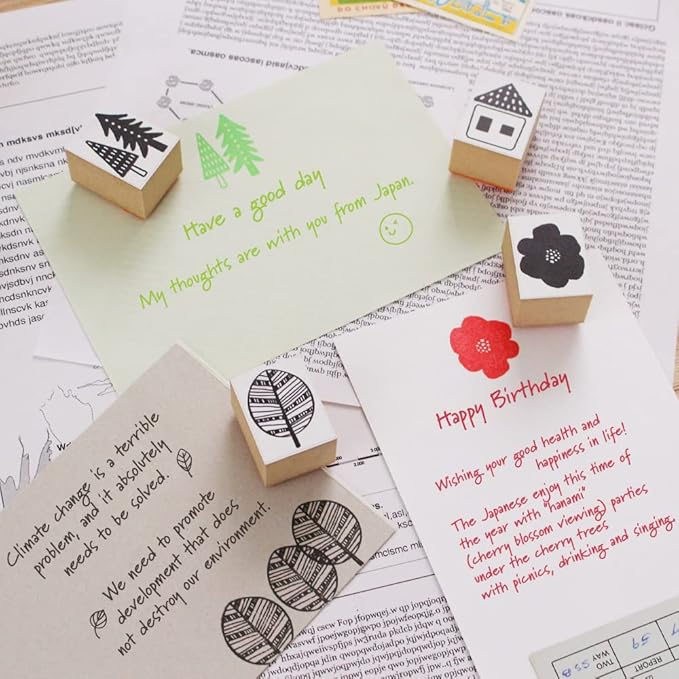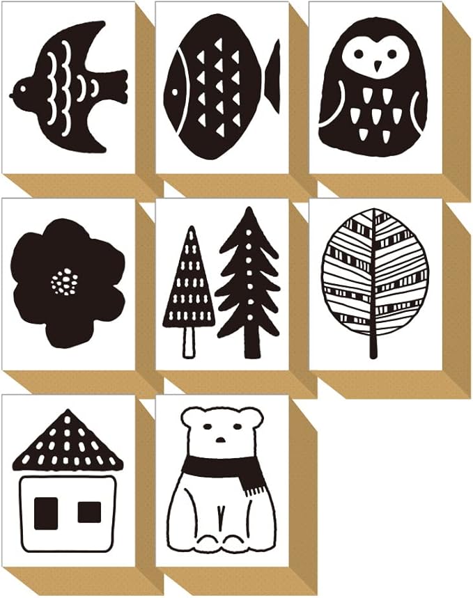 スタンプ かわいい はんこ 木製 ゴム印 セット 北欧 おしゃれ フクロウ 葉っぱ 魚 鳥 家 デザイン ブライダル カード ポストカード 一筆箋 文房具 プレゼント 日本製 (#88)