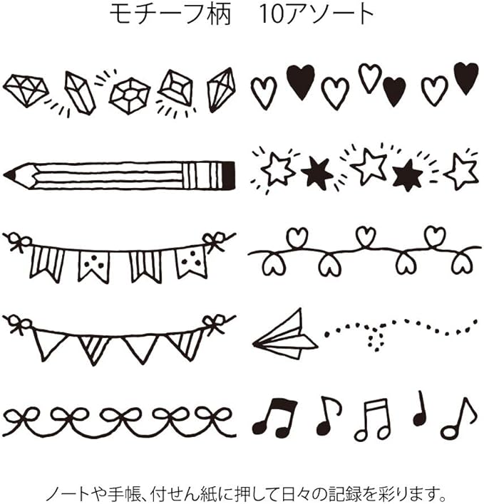 ダイアリーやノート、付箋、カードをかわいくデコレーション! 「モチーフ柄」は1つのスタンプで、リボンやハート、宝石、音符など、全部で10種類の柄を切り替えて使用できます。