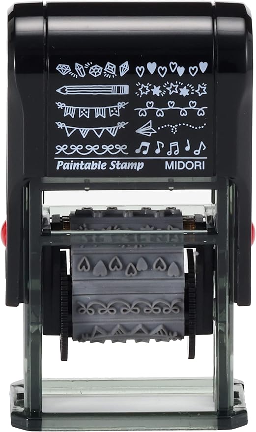 回転して柄を選べ、ノートやダイアリーなどを簡単にデコレーションできる楽しいスタンプです。