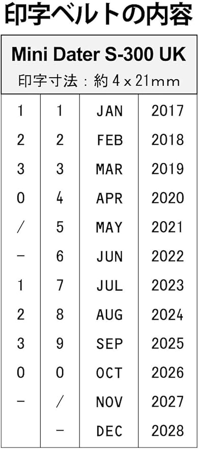 【その他】スタンプ台不要の回転式日付印、鮮明な連続捺印が可能。手帳や名刺等の日付を記録したい場合に最適。印字内容は Day Month Year の英国仕様の4連タイプ※年号は開始年より11年後までのみ印字可。印字サイズは約4mm 21mm、黒インク、丸G体