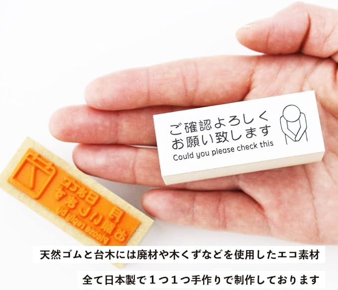 仕事で使えるかわいくておしゃれなエコスタンプ。4個セット。 今までのスタンプにないような、おしゃれなデザインと手頃な価格が魅力です! 素材には天然ゴムとスタンプの台木には廃材や木くずなどを使用し環境に配慮しています。 シンプルな使い心地です。全て日本製で1つ1つ手作りで制作しております。 シンプルでかわいいパッケージ。プレゼントにもどうぞ。